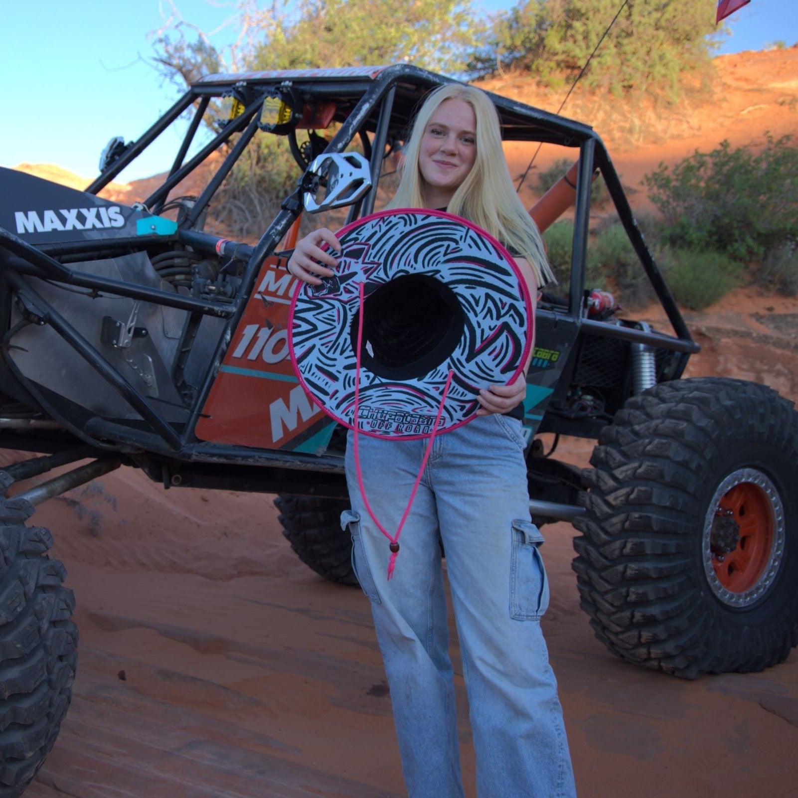 Stay shaded in our Chupacabra Offroad sun hat! Perfect for those warm days in the desert or by the water. UTV racing-inspired graphic design under the Magenta trim.