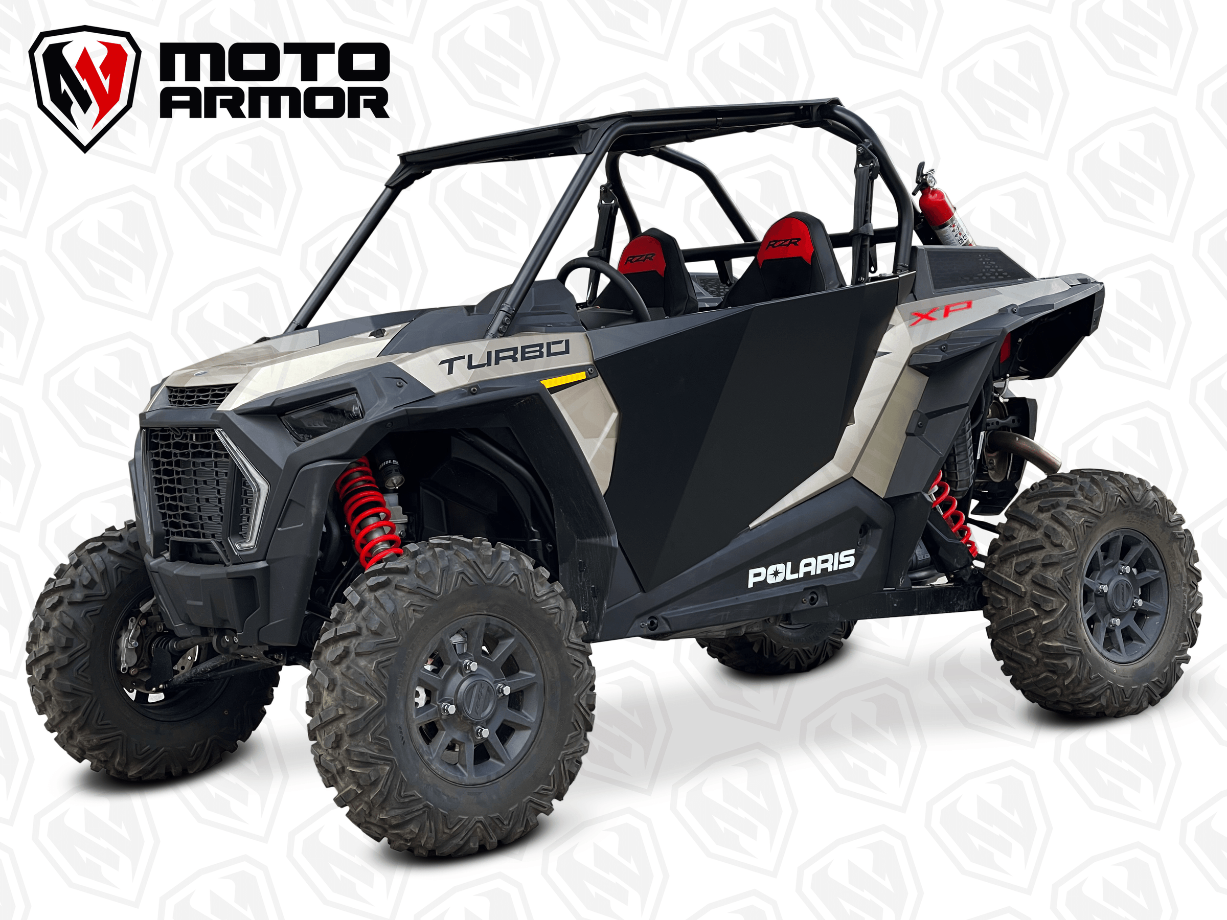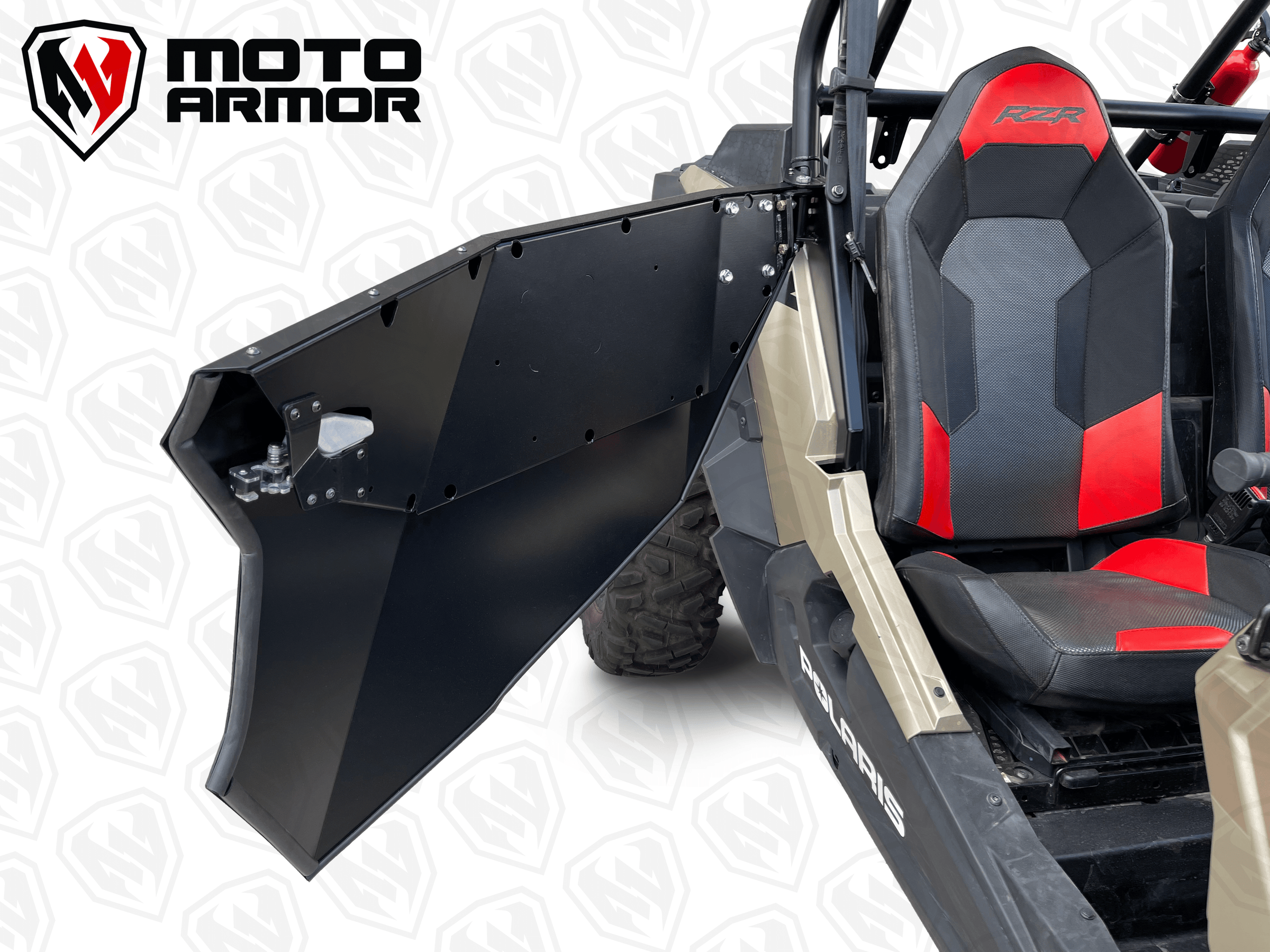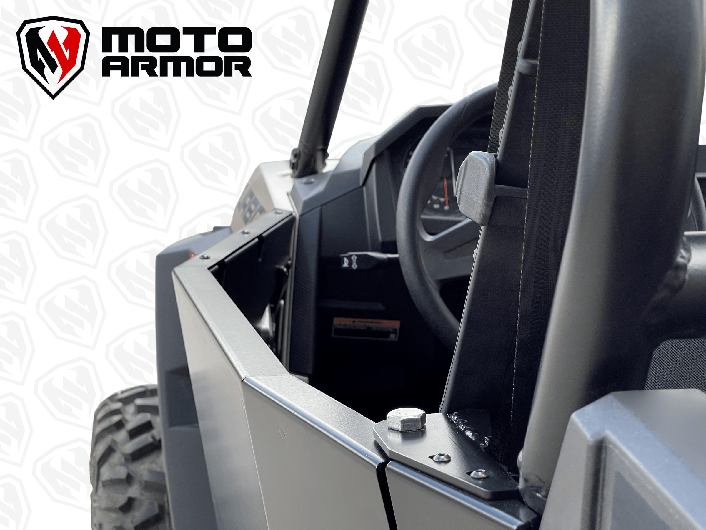 Moto Armor Aluminum Doors for RZR 2 Seat XP 1000, XP Turbo, and Turbo S Developed using 3D Scanning, 3D Cad, and CNC Manufacturing all in the USA. Moto Armor doors offer the best in design and function by replacing everything except the stock latches. This allowed the hinge point to be moved back for a cleaner look while providing easy entry and exit. Door skins and frames are .090” thick aluminum which is the thickest in the industry. Mounting and hinge parts are made out 3/16” thick steel for strength and durability. Hinge bolt is ½” Diameter and bearings are oil impregnated so they don’t need to be oiled and they won’t cease up. Please email or call for raw door availability. Features: High and wide design looks great and provides more room than stock doors 3D cad designed and CNC cut and formed (all in the USA) .090” thick aluminum skins and frames (thickest in the industry) Steel mounts and hinge plates for strength and durability Flush no-hole hardware for the cleanest look in the industry Single bolt removal without need to readjust (after initial install) Re-uses factory latches Oil impregnated hinge bearings never need lube and won’t cease up. Fits any door bags made for stock doors Pre marked for cutting to fit factory speakers (modification required) Designed & Made in the USA Fitment: 2014-2023 RZR XP 1000 2 Door2016-2021 RZR XP Turbo 2 Door2018-2021 RZR Turbo S 2 Door Click Here for Installation Instructions Doors: Door orders ship on average in 1-4 weeks from purchase. Please call for a more specific time frame. Due to difficulty with shipping, return shipping, and specific way we package doors, all sales are final with no option to return (damaged product still applies). Doors may not fit with aftermarket products such as: Aftermarket cages Door bags Cab Enclosures Body kits Nerf bars Tree kickers Must Read!! Warranty: Any warranty claims will require pictures emailed within 5 business days of receiving order. WARNING: Cancer and Reproductive Harm - www.P65Warnings.ca.gov