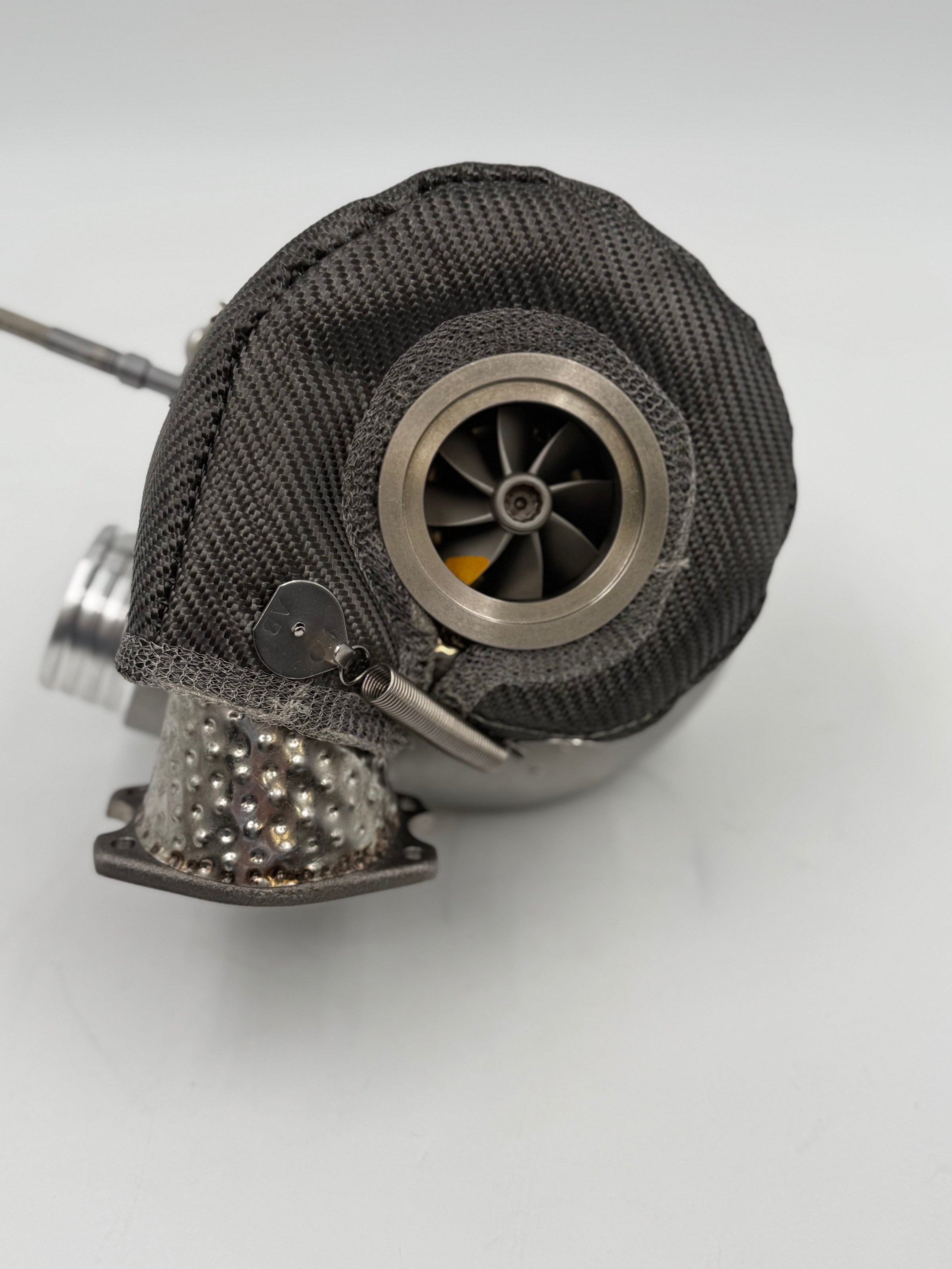 Reducing under hood temperatures generated from the turbo assists in decreasing turbo lag and avoids damaging various surrounding components, body surfaces, and hoses. Turbo heat shield blanket is excellent for isolating the heat produced by the turbocharger. The turbo heat shield blanket is constructed with a titanium fiber outer layer and it is internally insulated with high-temperature ceramic insulated pad that is rated to 1800°F continuous and 2300°F peak which is then overlaid with a high-temperature stainless steel mesh for increased durability and improved thermal resistance. The outer surface features stainless steel capstan rivets that accept spring clips allowing the blanket to fit with ease.