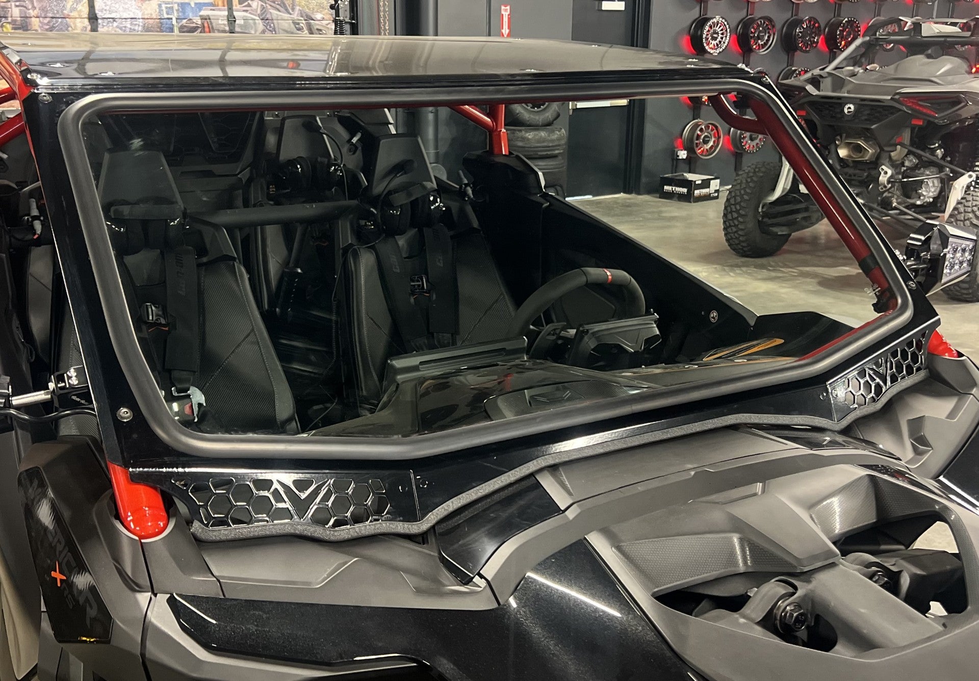 Moto Armor VOODOO MAVERICK R FULL GLASS WINDSHIELDThe VOODOO Maverick R Cage just became better with a full Moto Armor Windshield. Our windshield gives you max visibility with open vents for excellent airflow. Its a perfect match! Features: Automotive Laminated Safety Glass with DOT Stamp Frame is made out of .125" Aluminum Black Powder-coat finish 3D CAD Designed/CNC Cut and Formed Billet Aluminum Mounting Clamps Black Stainless Steel Bolts and Washers Designed & Made in the USA Fitment:2024+ Maverick R with VOODOO RIDERS Cage (refer to voodoo to make sure windshield will fit cage) Glass Windshields: Glass is very scratch resistant but not scratch proof! While very hard and durable, glass can still be scratched if contaminants such as sand, small rocks, dirt etc. being rubbed on glass. Towels, windshield wipers, and squeegees can scratch glass if there are contaminants on the windshield. Any damage that is caused by interference from other aftermarket products will not be subject to any warranty claim. At time of purchase, buyer agrees to all policies, procedures, and returns processes. Windshields may not fit with aftermarket products such as: Roofs Stereos Mirrors with thick clamps Cab enclosures Must Read!!Shipping times: Most orders ship within 1-5 business days and take 2-5 business days after for delivery on average. Some orders may take longer. We do not guarantee shipping times and cannot control shipping carriers.Returns: Returns are subject to Restocking Fee and Return shipping costs. Items that have been installed or had protective film removed cannot be returned.Warranty: Any warranty claims will require pictures emailed within 5 business days of receiving order. WARNING: Cancer and Reproductive Harm - www.P65Warnings.ca.gov